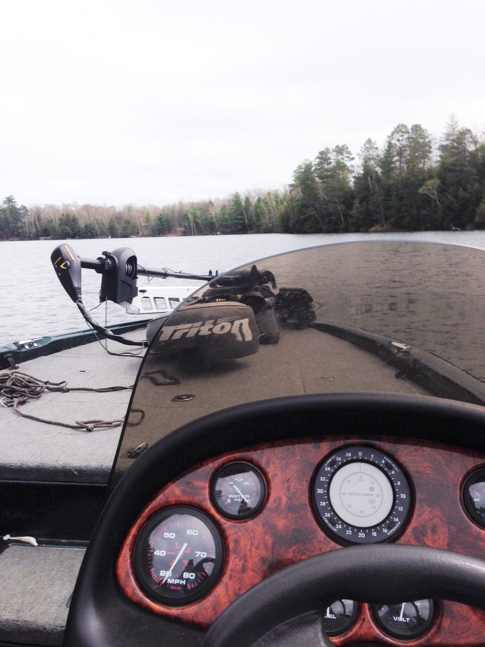 I decided that it was time to pull out for the day. I marked it as a very successful day. The boat and all accessories (bilge, live well pumps, and electronics) ran great and I brought 8 largemouth to the boat……well, everything worked well except my water pressure gauge. Even though my water pump/injector was running fine – had a great stream of water shooting out of the Mercury……my water pressure gauge was pegged to the right and stayed there even if I turned the motor off. As I drove across the lake I could reach under the dash, wiggle the gauge and could make the needle move. So I’ve either got a loose gauge or a bad gauge. I’ll fix that next time I come up north.