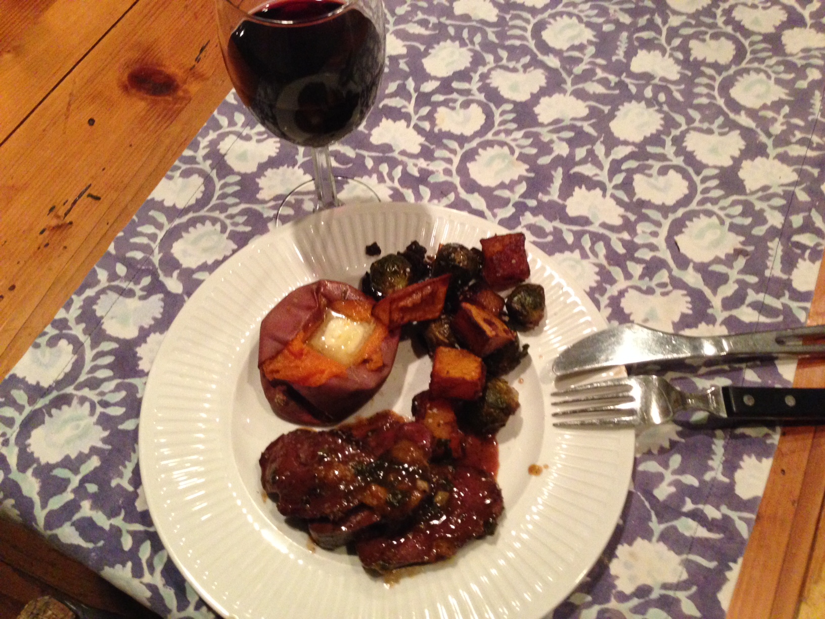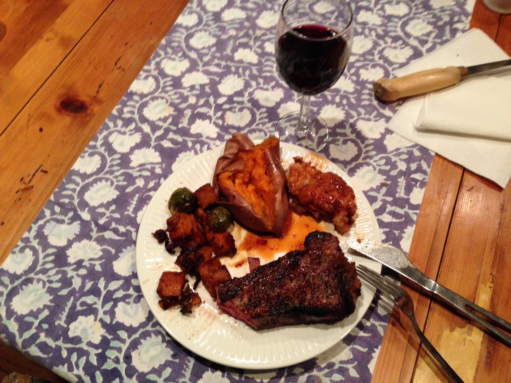 That evening, we had a great dinner of fried turkey breast, grilled New York strips, roasted vegetables, and a hearty red wine.