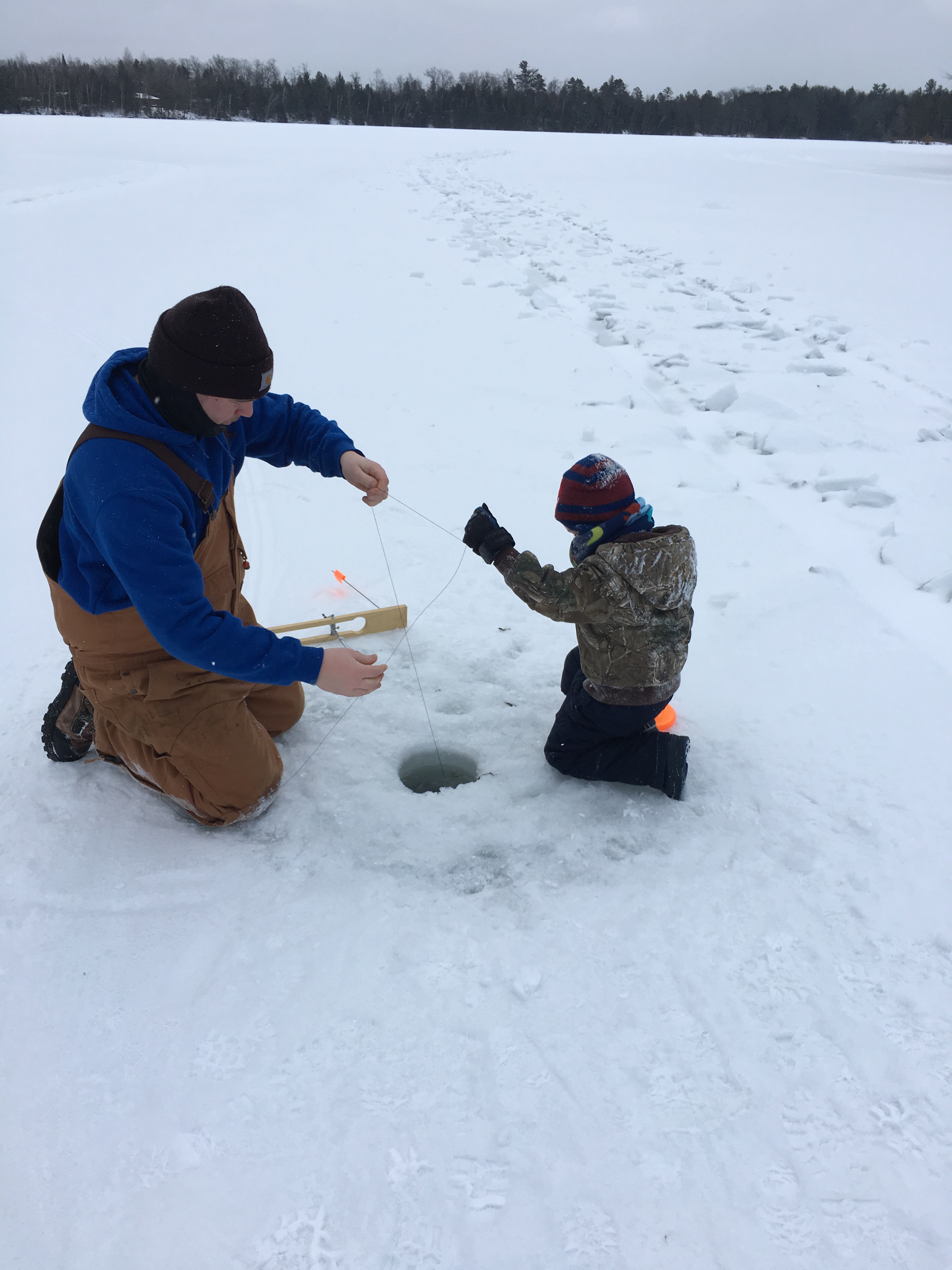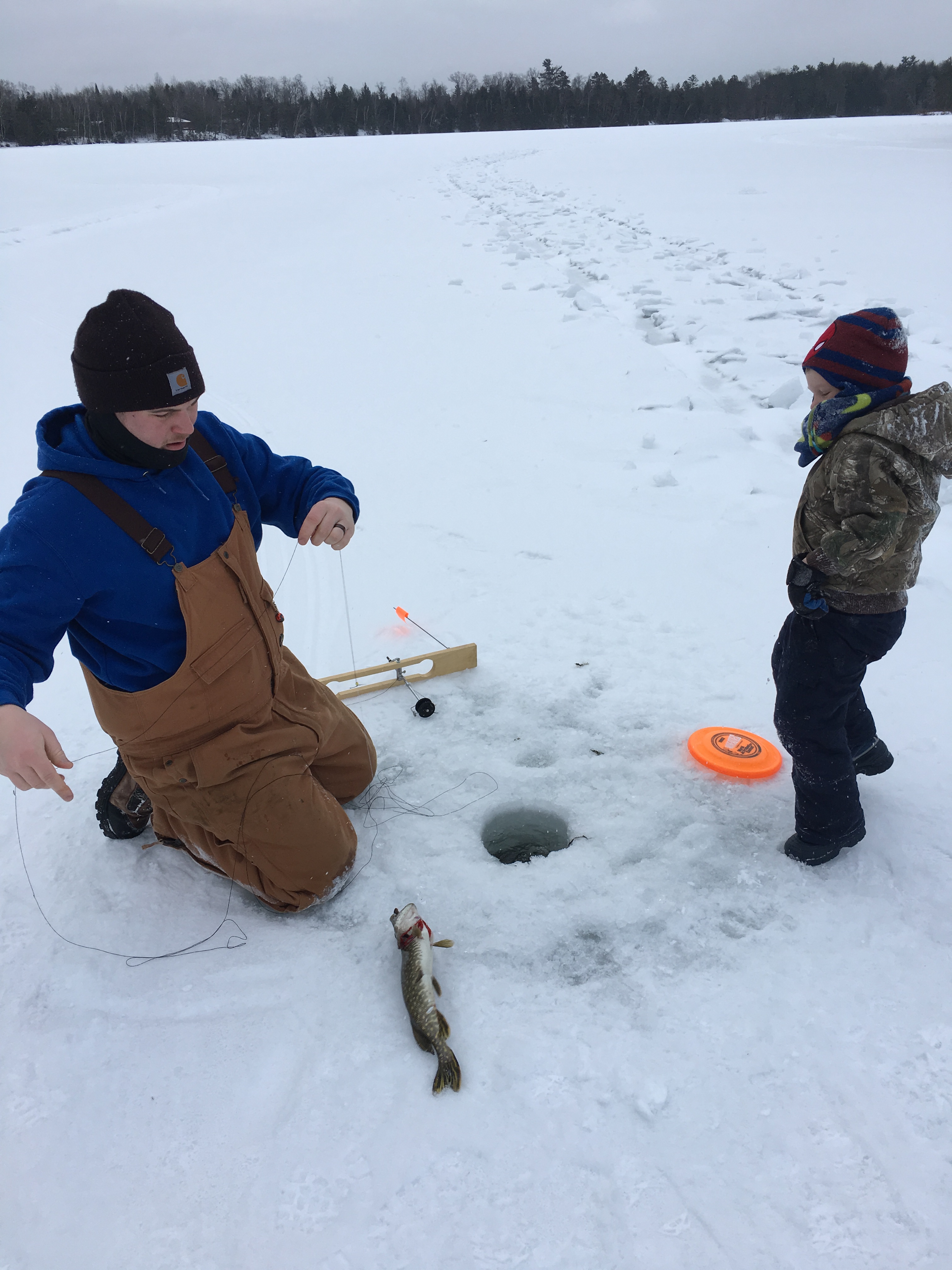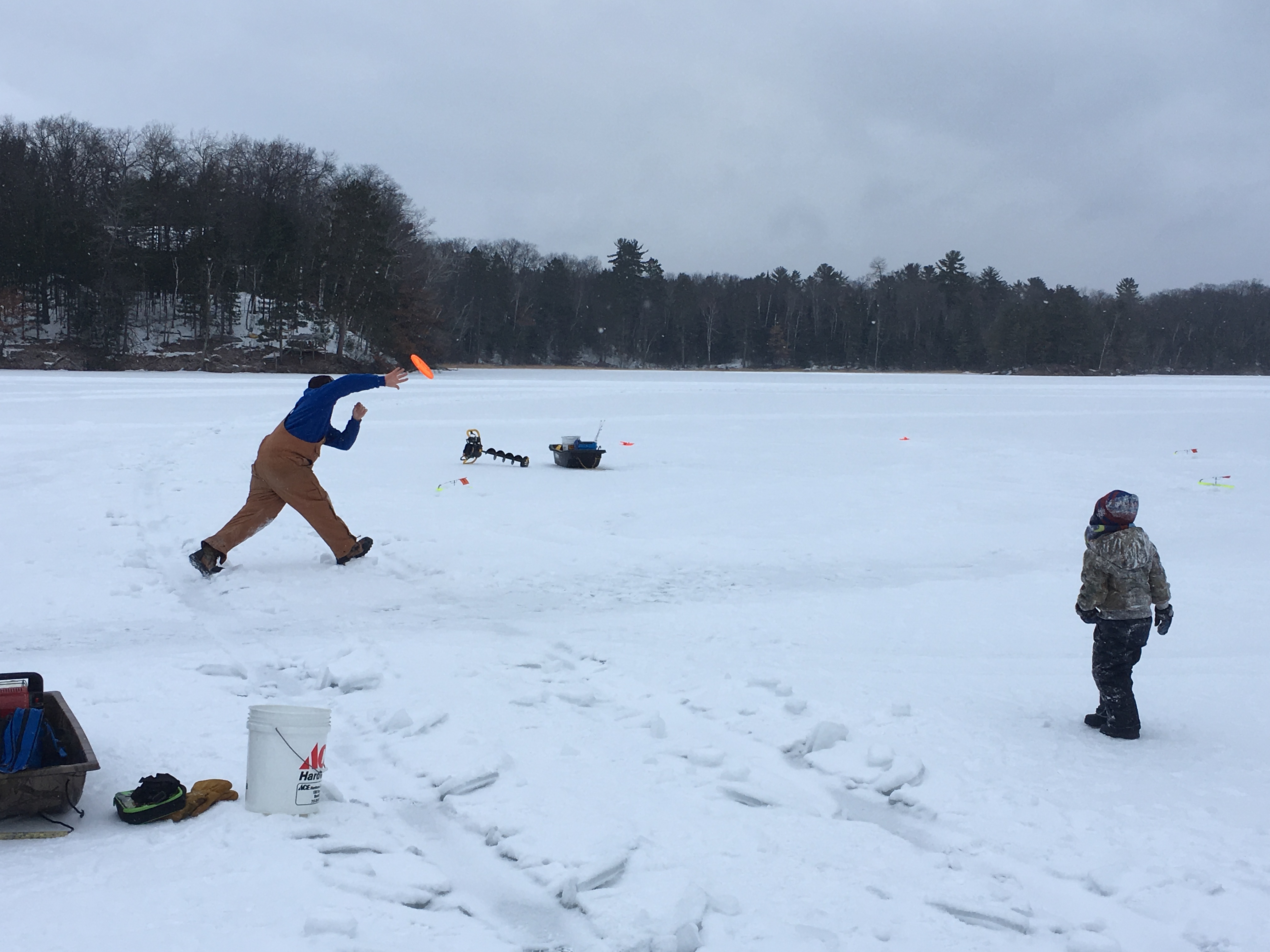 There’s still lots to do though in the northwoods even if a person can’t snowmobile! So Travis and Logan DeGolier came out for a few hours of ice fishing. Logan is a bundle of energy and absolutely loves to fish. We played a lot of Frisbee games until one of our flags would go up. Here’s a picture of Logan and then a picture of our playing Frisbee – great way to pass the time!