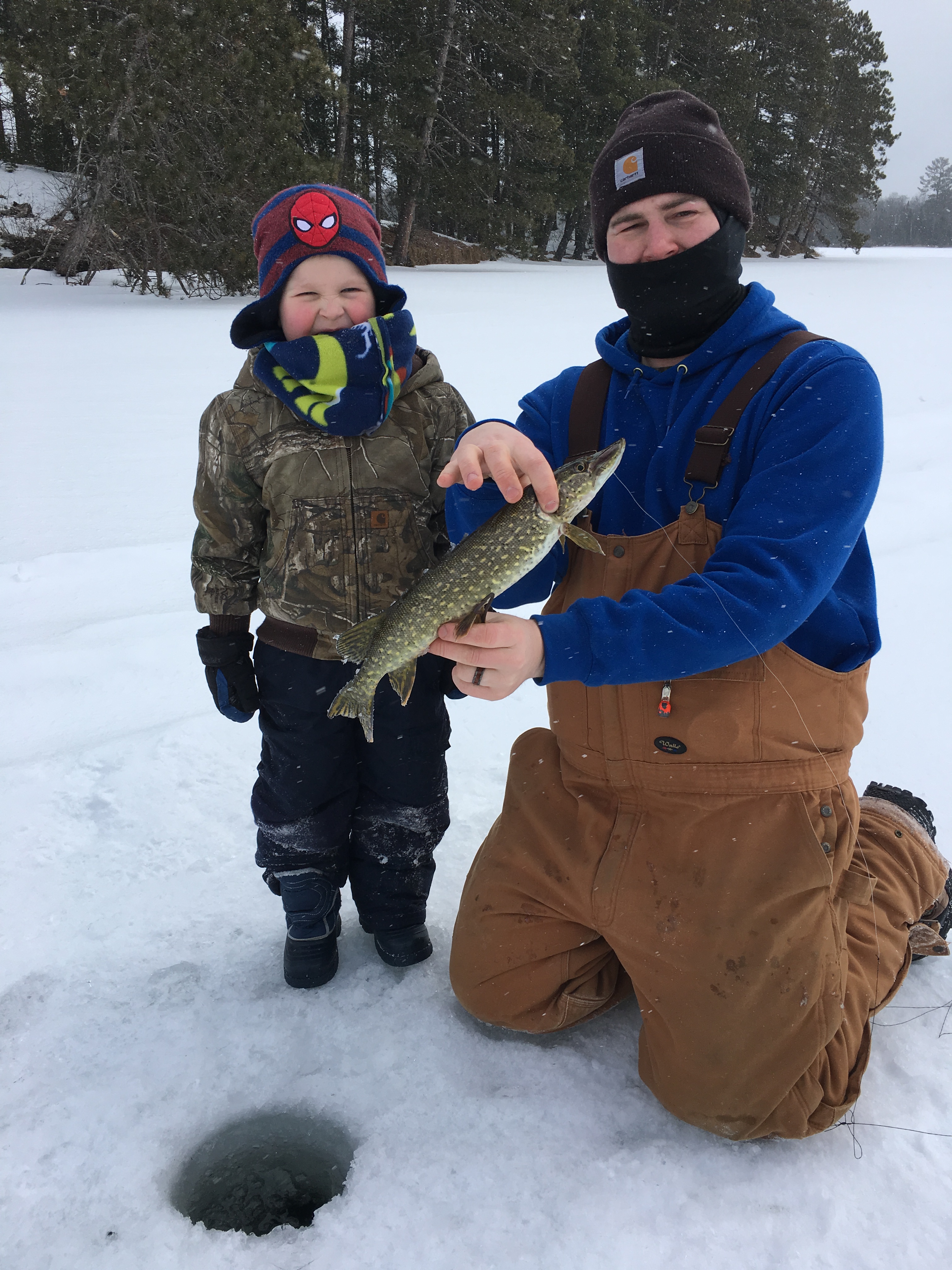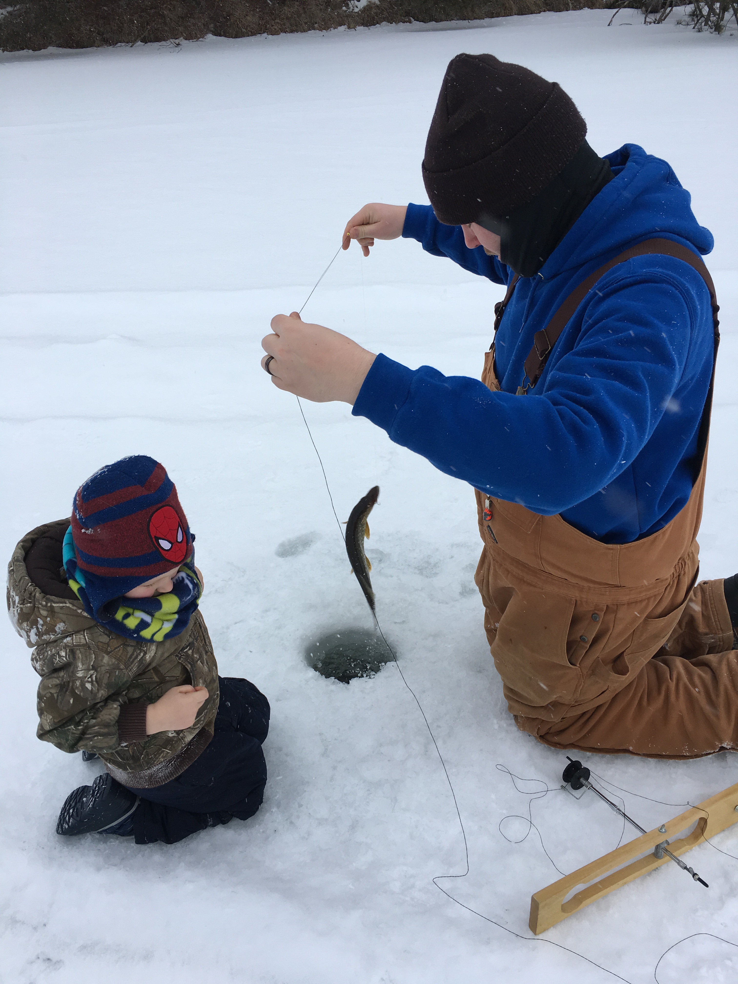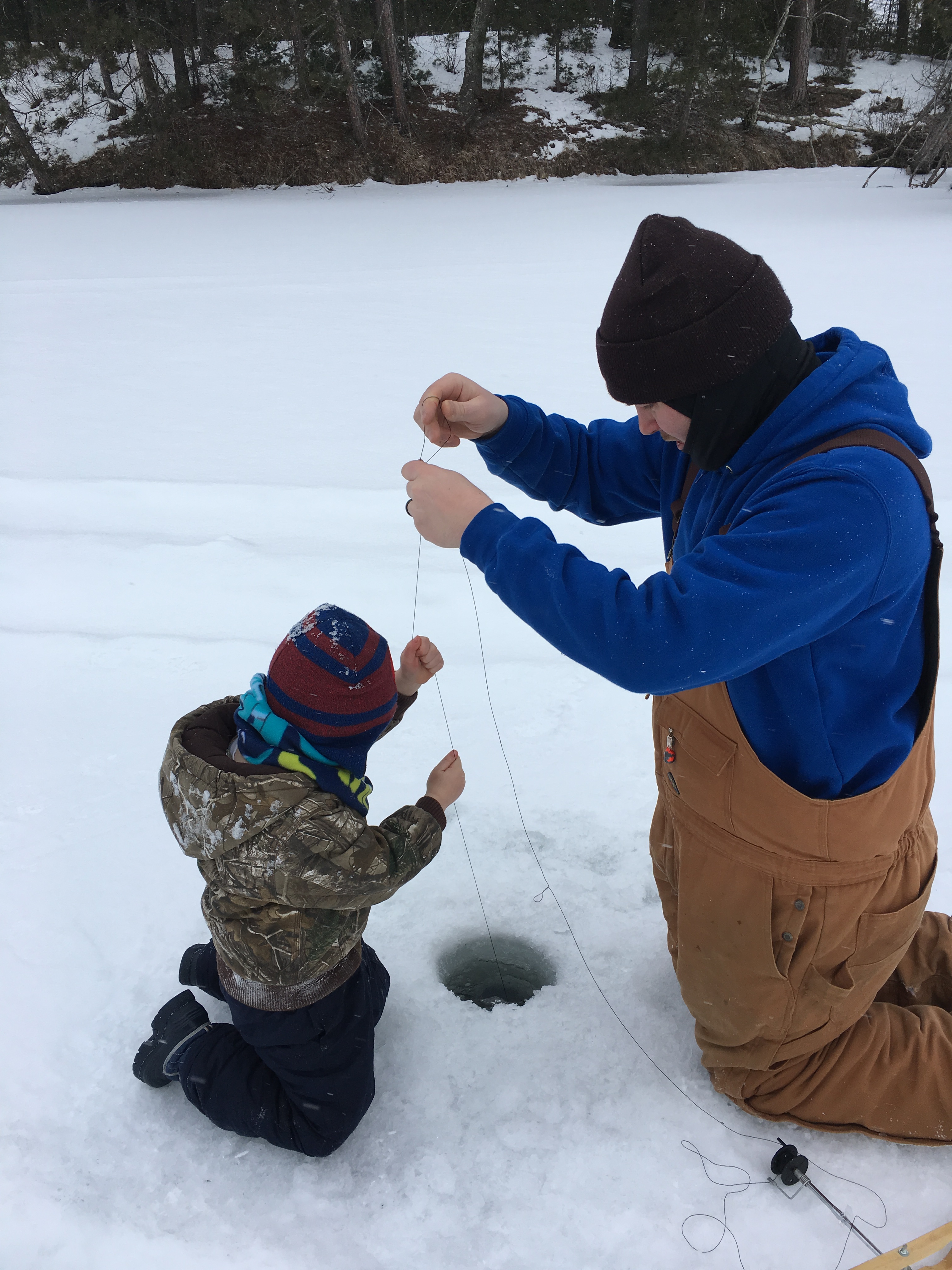 There’s still lots to do though in the northwoods even if a person can’t snowmobile! So Travis and Logan DeGolier came out for a few hours of ice fishing. Logan is a bundle of energy and absolutely loves to fish. We played a lot of Frisbee games until one of our flags would go up. Here’s a picture of Logan and then a picture of our playing Frisbee – great way to pass the time!