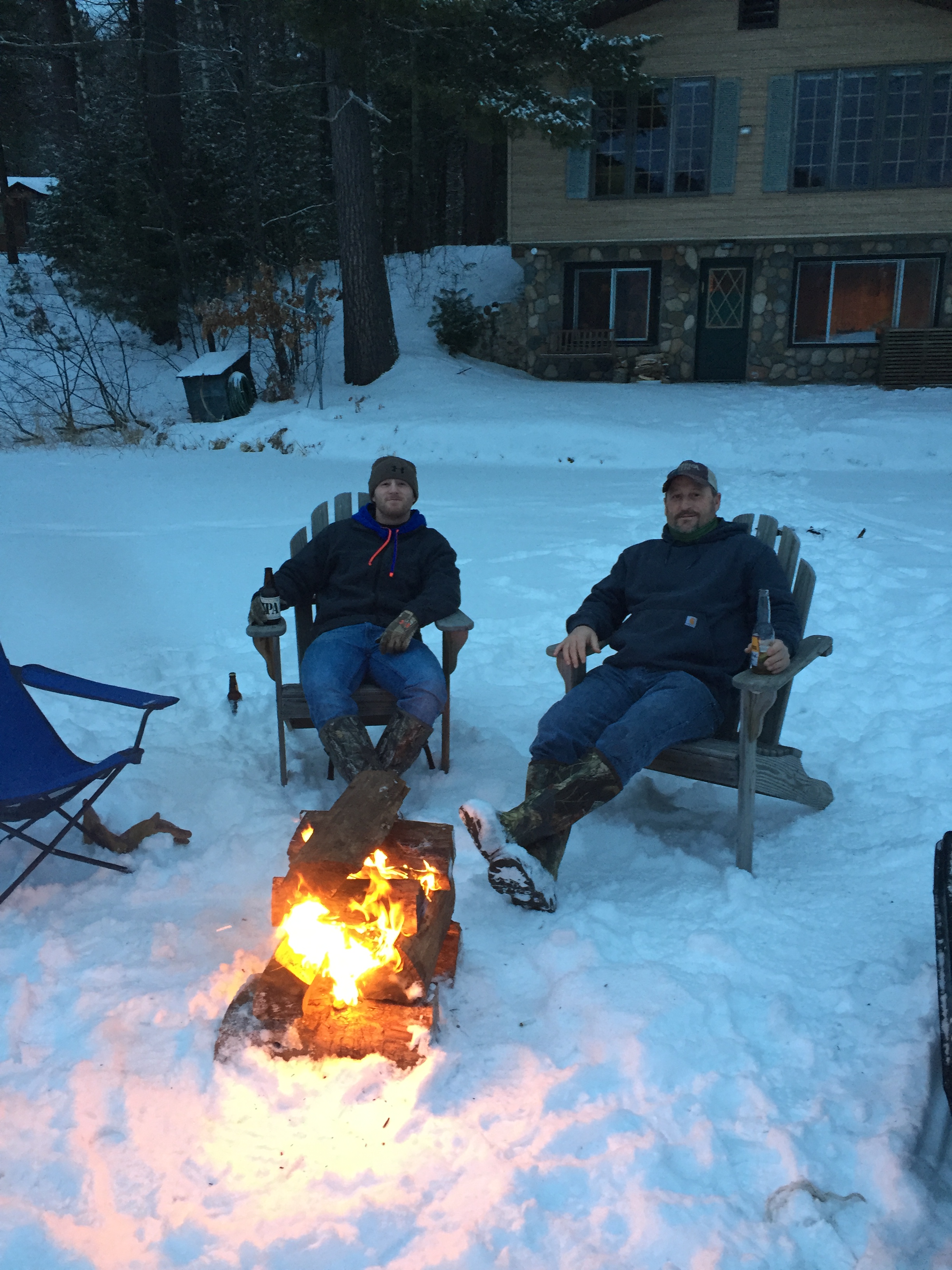 The next day we began to get a little snow – not much, but enough to ride. And on January 31st, Scott and Zach Deutsch drove up from southern Indiana to do a little riding. It was great to see them. Scott had been up once before but this was Zach’s first time snowmobiling. Since it was late in the day we decided to not ride that day, but instead had a fire on the ice. Was a relaxing evening watching the fire and enjoying the stillness of the outdoors…